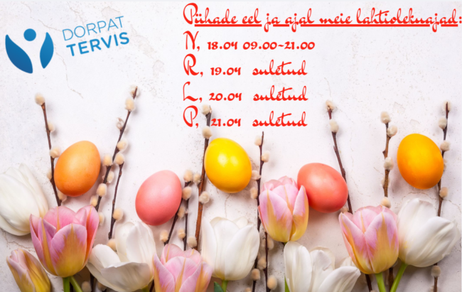 Kevadpühad Dorpat Tervises Uudised/info/artiklidBy wink17.04.2019Kevadpüha eel oleme 18. aprill (N) avatud 9.00-21.00 ja 19.04-21.04 (R-P) oleme suletud.