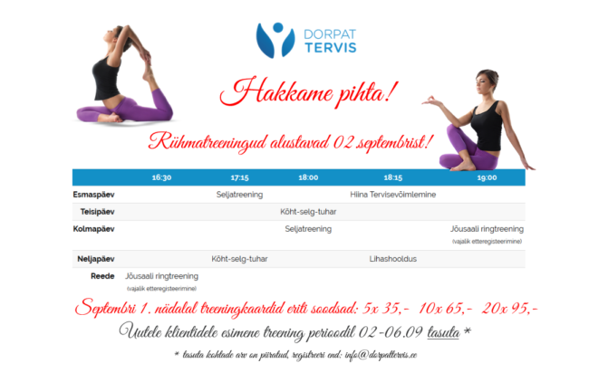 Dorpat Tervise rühmatreeningud alustavad 02.septembrist! Esmaspäev: 17.15 Seljatreening 18.15 Hiina tervisevõimlemine ————————————— Teisipäev: 18.00 Kõht-selg-tuhar ————————————— Kolmapäev: 18.00 Seljatreening 19.00 Jõusaali ringtreening ————————————— Neljapäev: 17.15 Kõht-selg-tuhar 18.15 Lihashooldus ————————————— Reede: 16.30 Jõusaali ringtreening