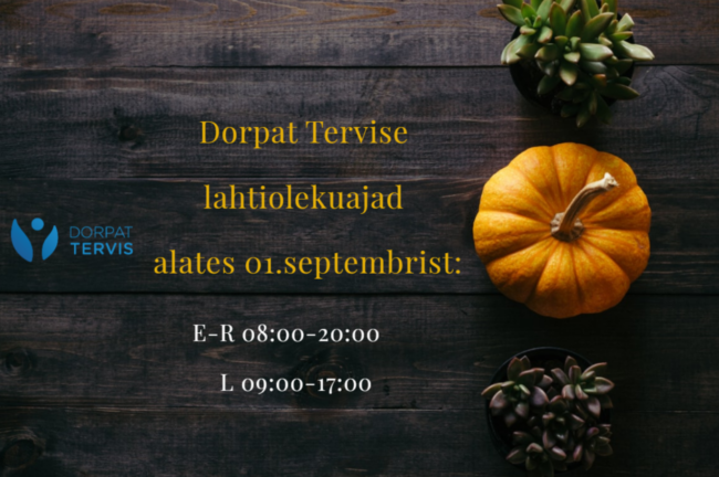 Dorpat Tervise lahtiolekuajad alates septembrist Uudised/info/artiklidBy Katrin Vask01.09.2020Lahtiolekuajad alates septembrist E-R 8:00-20.00 / L 9:00-17:00