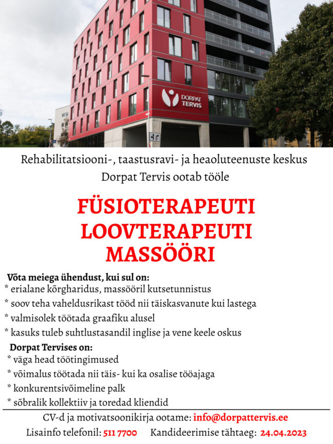 Tööpakkumine FÜSIOTERAPEUDILE, LOOVTERAPEUDILE JA MASSÖÖRILE