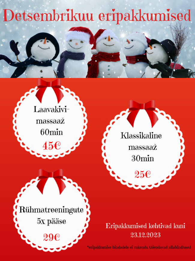 Jõuluaeg on käes! DETSEMBRI ERIPAKKUMISTE hulgast leiad midagi head endale, sõbrale ja jõuluvana kingikotti Laavakivimassaaž 60 min 45€ / tavahind 55€ Klassikaline massaaž 30 min 25€ / tavahind 35€ Rühmatreeningute 5x pääse 29€ / tavahind 45€ Broneeri aeg: 510 9944, 7337 196 või bron@dorpattervis.ee Saadaval ka kinkekaardid detsembri eripakkumiste hindadega!