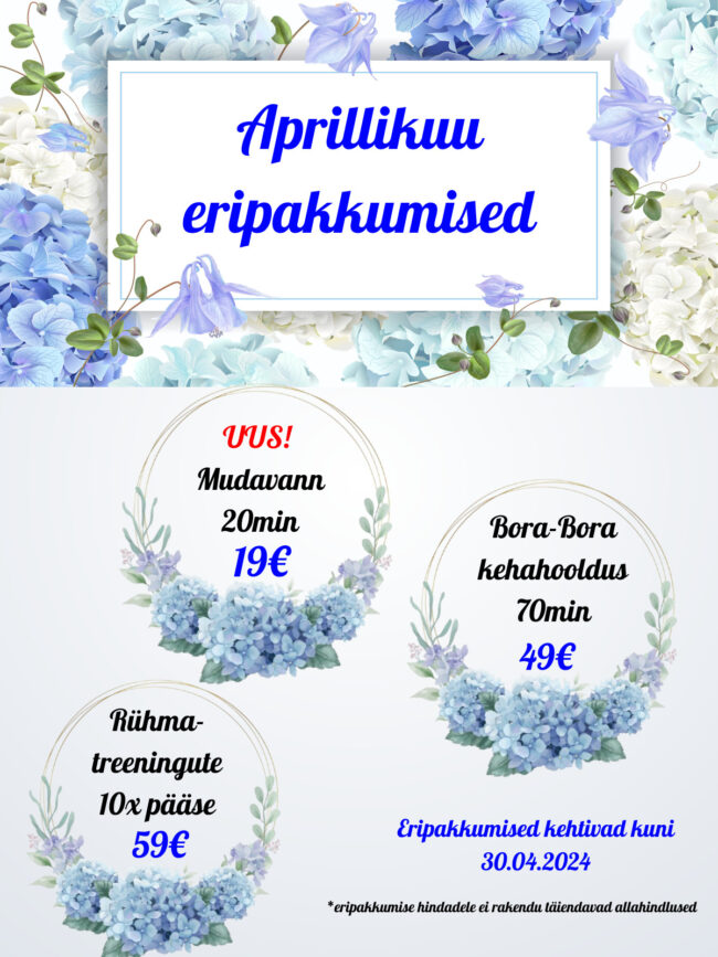 APRILLIKUU ERIPAKKUMISED Dorpat Tervises: UUS! Mudavann Hiiumaa ravimuda ektraktiga 20 min 19€ / tavahind 29€ Bora-Bora kehahooldus 70 min 49€ / tavahind 59€ Rühmatreeningute 10x pääse 59€ / tavahind 75€ Broneeri aeg: 510 9944, 7337 196 või bron@dorpattervis.ee Saadaval ka kinkekaardid aprilli eripakkumiste hindadega!