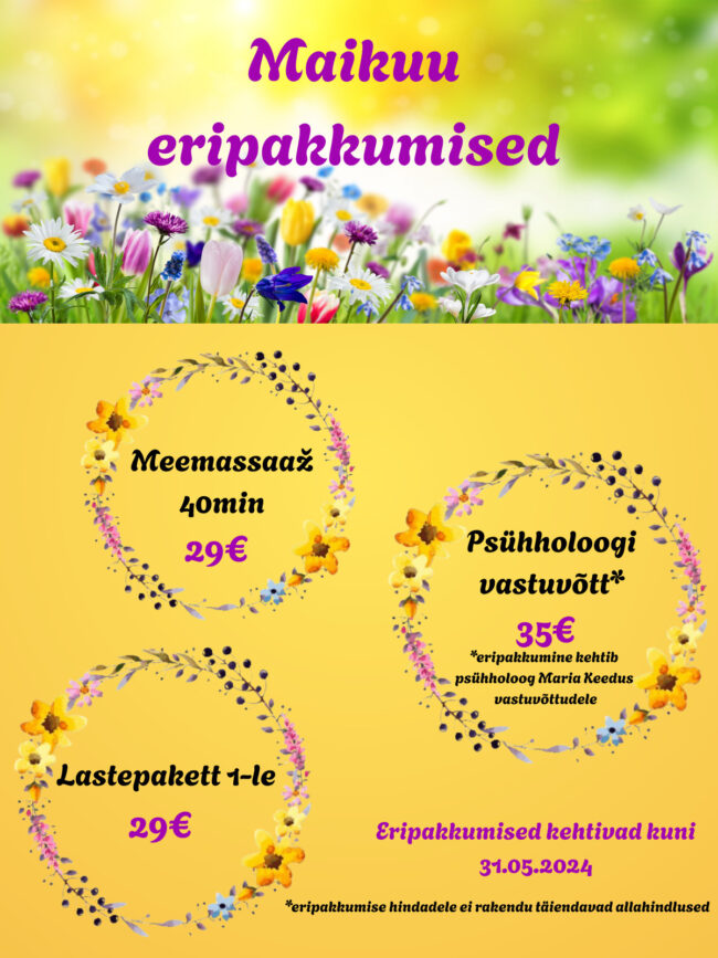 MAI ERIPAKKUMISED Dorpat Tervises: Meemassaaž 40 min 29€ / tavahind 39€ Psühholoogi vastuvõtt 35€ / tavahind 45€ Lastepakett 1-le 29€ / tavahind 39€ Broneeri aeg: 510 9944, 7337 196 või bron@dorpattervis.ee Saadaval ka kinkekaardid mai eripakkumiste hindadega!