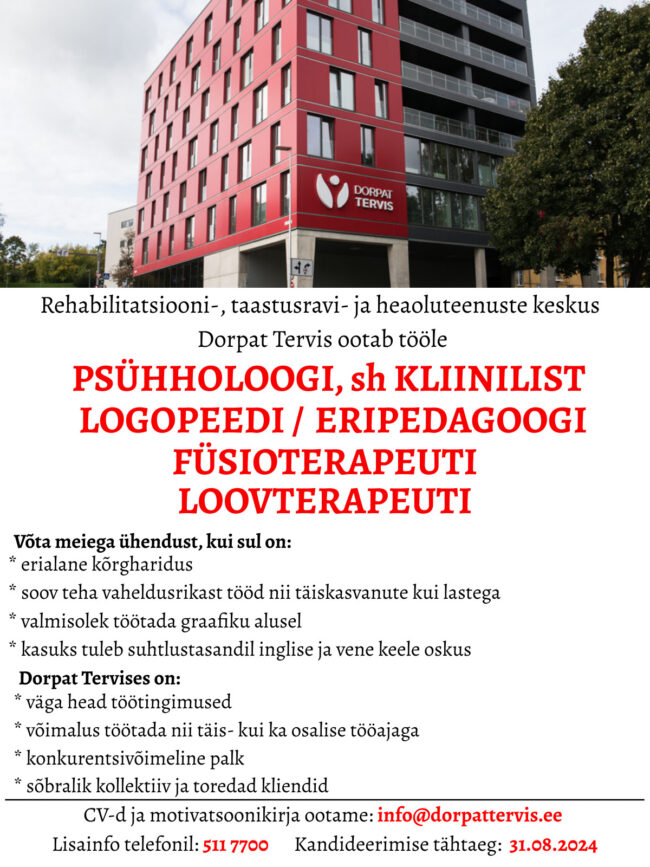 Dorpat Tervis otsib oma meeskonda LOGOPEEDI, ERIPEDAGOOGI,FÜSIOTERAPEUTI, LOOVTERAPEUTI, PSÜHHOLOOGI ja KLIINILIST PSÜHHOLOOGI. CV ootame: info@dorpattervis.ee ja lisainfot saab telefonil: 511 7700 Kandideerimise tähtaeg: 31.08.2024.