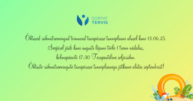 Õhtused rühmatreeningud toimuvad tavapärase tunniplaani alusel kuni 13.06.2025. Seejärel jääb kuni augusti lõpuni tööle 1 trenn nädalas, kolmapäeviti 17:30 Terapeutiline seljarühm. Õhtuste rühmatreeningute tavapärase tunniplaaniga jätkame alates septembrist.