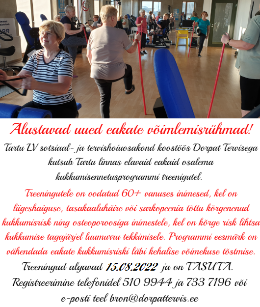 Tartu LV sotsiaal- ja tervishoiuosakond koostöös Dorpat Tervisega kutsub Tartu linnas elavaid eakaid osalema kukkumisennetusprogrammi treeningutes.