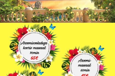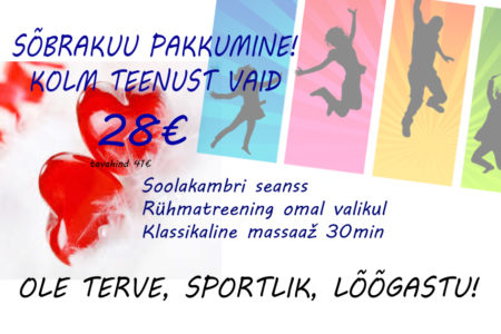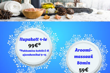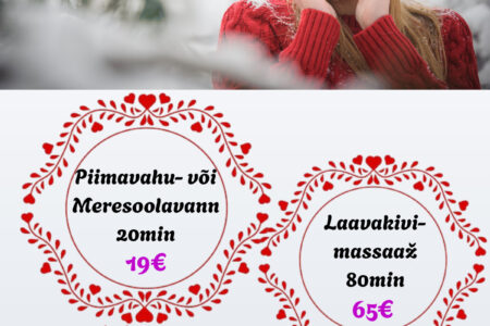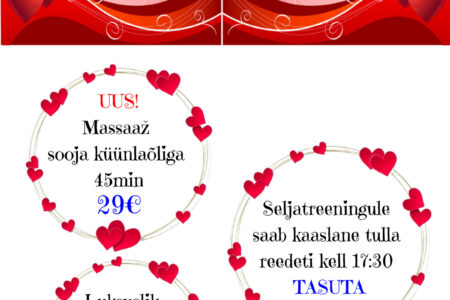 VEEBRUARI ERIPAKKUMISED Dorpat Tervises: UUS! Massaaž sooja küünlaõliga 45 min 29€ / tavahind 39€ Luksuslik piimavahuvann 20 min 19€ / tavahind 29€ Seljatreeningule saab kaaslane reedeti kell 17:30 TASUTA Broneeri aeg: 510 9944, 7337 196 või bron@dorpattervis.ee Saadaval ka kinkekaardid veebruari eripakkumiste hindadega!