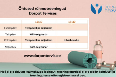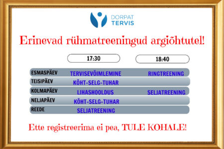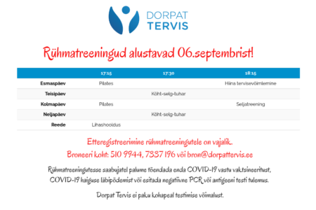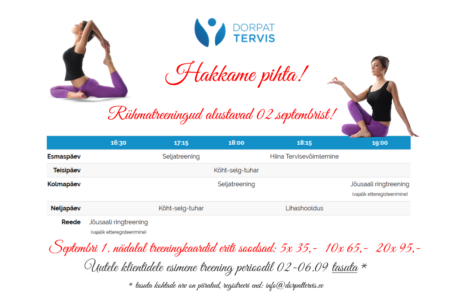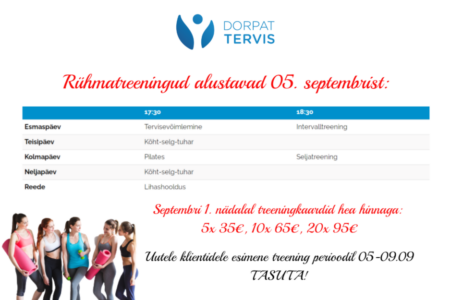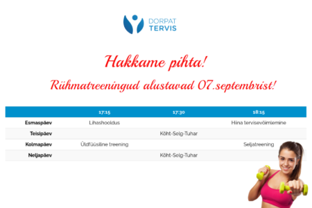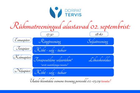 Dorpat Tervise rühmatreeningud alustavad 02.septembrist! Esmaspäev: 17.15 Seljatreening 18.15 Hiina tervisevõimlemine ————————————— Teisipäev: 18.00 Kõht-selg-tuhar ————————————— Kolmapäev: 18.00 Seljatreening 19.00 Jõusaali ringtreening ————————————— Neljapäev: 17.15 Kõht-selg-tuhar 18.15 Lihashooldus ————————————— Reede: 16.30 Jõusaali ringtreening