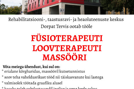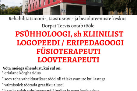 Dorpat Tervis otsib oma meeskonda LOGOPEEDI, ERIPEDAGOOGI,FÜSIOTERAPEUTI, LOOVTERAPEUTI, PSÜHHOLOOGI ja KLIINILIST PSÜHHOLOOGI. CV ootame: info@dorpattervis.ee ja lisainfot saab telefonil: 511 7700 Kandideerimise tähtaeg: 31.08.2024.