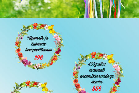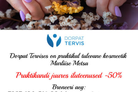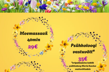 MAI ERIPAKKUMISED Dorpat Tervises: Meemassaaž 40 min 29€ / tavahind 39€ Psühholoogi vastuvõtt 35€ / tavahind 45€ Lastepakett 1-le 29€ / tavahind 39€ Broneeri aeg: 510 9944, 7337 196 või bron@dorpattervis.ee Saadaval ka kinkekaardid mai eripakkumiste hindadega!