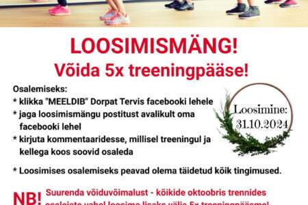 LOOSIMISMÄNG! Võida 5x treeningpääse! Osalemiseks: klikka “MEELDIB” Dorpat Tervis Facebooki lehele jaga loosimismängu postitust avalikult oma Facebooki lehel kirjuta kommentaaridesse, millisel treeningul ja kellega koos soovid osaleda Loosimises osalemiseks peavad olema täidetud kõik tingimused. Loosimine toimub 31.10.2024. NB! SUURENDA VÕIDUVÕIMALUST ka kõikide oktoobris trennides osalejate vahel loosime lisaks välja 5x treeningpääsme