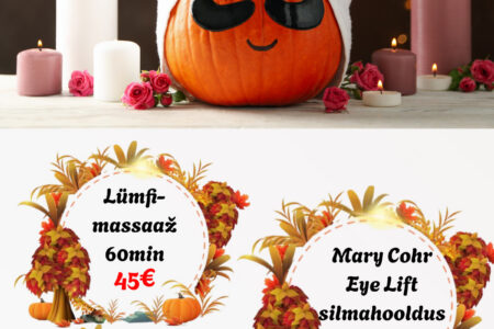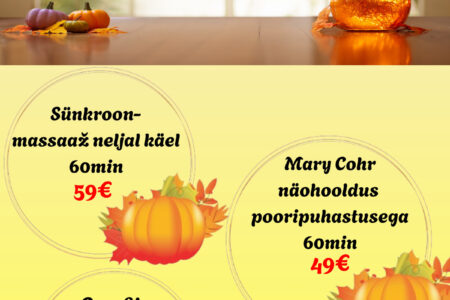 OKTOOBRI ERIPAKKUMISED Dorpat Tervises: Sünkroonmassaaž neljal käel 59€ / tavahind 69€ Mary Cohr näohooldus pooripuhastusega 60min 49€ / tavahind 59€ Parafiin kätele kuur 5x a’ 20min 69€ / tavahind 100€ Broneeri aeg: 510 9944, 7337 196 või bron@dorpattervis.ee *Saadaval ka kinkekaardid oktoobri eripakkumiste hindadega!