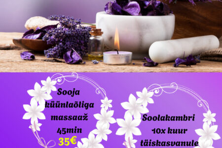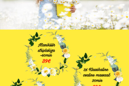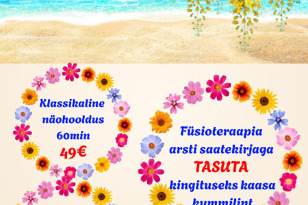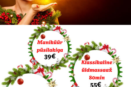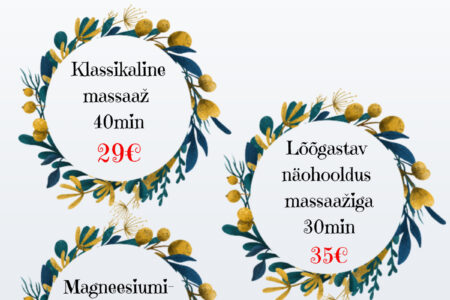 Hellita ennast või üllata oma lähedasi. Novembrikuu eripakkumised eriti heade hindadega kuni 30.11.2023 Klassikaline massaaž 40 min 29€ / tavahind 39€ Lõõgastav näohooldus massaažiga 30 min 35€ / tavahind 45€ Magneesiumivann 20 min 19€ / tavahind 29€ Broneeri aeg: 510 9944, 7337 196 või bron@dorpattervis.ee
