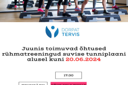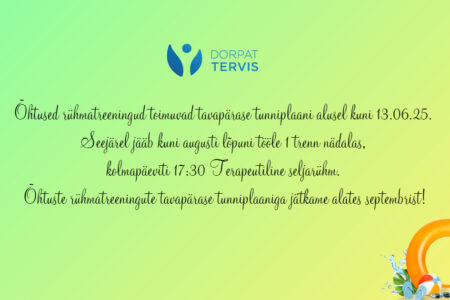 Õhtused rühmatreeningud toimuvad tavapärase tunniplaani alusel kuni 13.06.2025. Seejärel jääb kuni augusti lõpuni tööle 1 trenn nädalas, kolmapäeviti 17:30 Terapeutiline seljarühm. Õhtuste rühmatreeningute tavapärase tunniplaaniga jätkame alates septembrist.