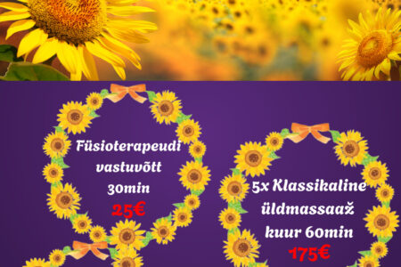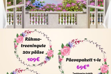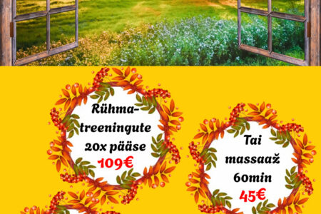 SEPTEMBRI ERIPAKKUMISED Dorpat Tervises: Rühmatreeningute 20x pääse 109€ / tavahind 129€ Tai massaaž 60 min 45€ / tavahind 55€ Maniküür ~40 min 25€ / tavahind 35€ Broneeri aeg: 510 9944, 7337 196 või bron@dorpattervis.ee Saadaval ka kinkekaardid septembri eripakkumiste hindadega!