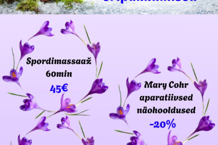 MÄRTSI ERIPAKKUMISED Dorpat Tervises: Jalatalla massaaž 60 min 35€ / tavahind 45€ Savisoojendus 20 min 15€ / tavahind 20€ Ripsmete ja kulmude komplektteenus 19€ / tavahind 30€ Broneeri aeg: 510 9944, 7337 196 või bron@dorpattervis.ee Saadaval ka kinkekaardid märtsi eripakkumiste hindadega!